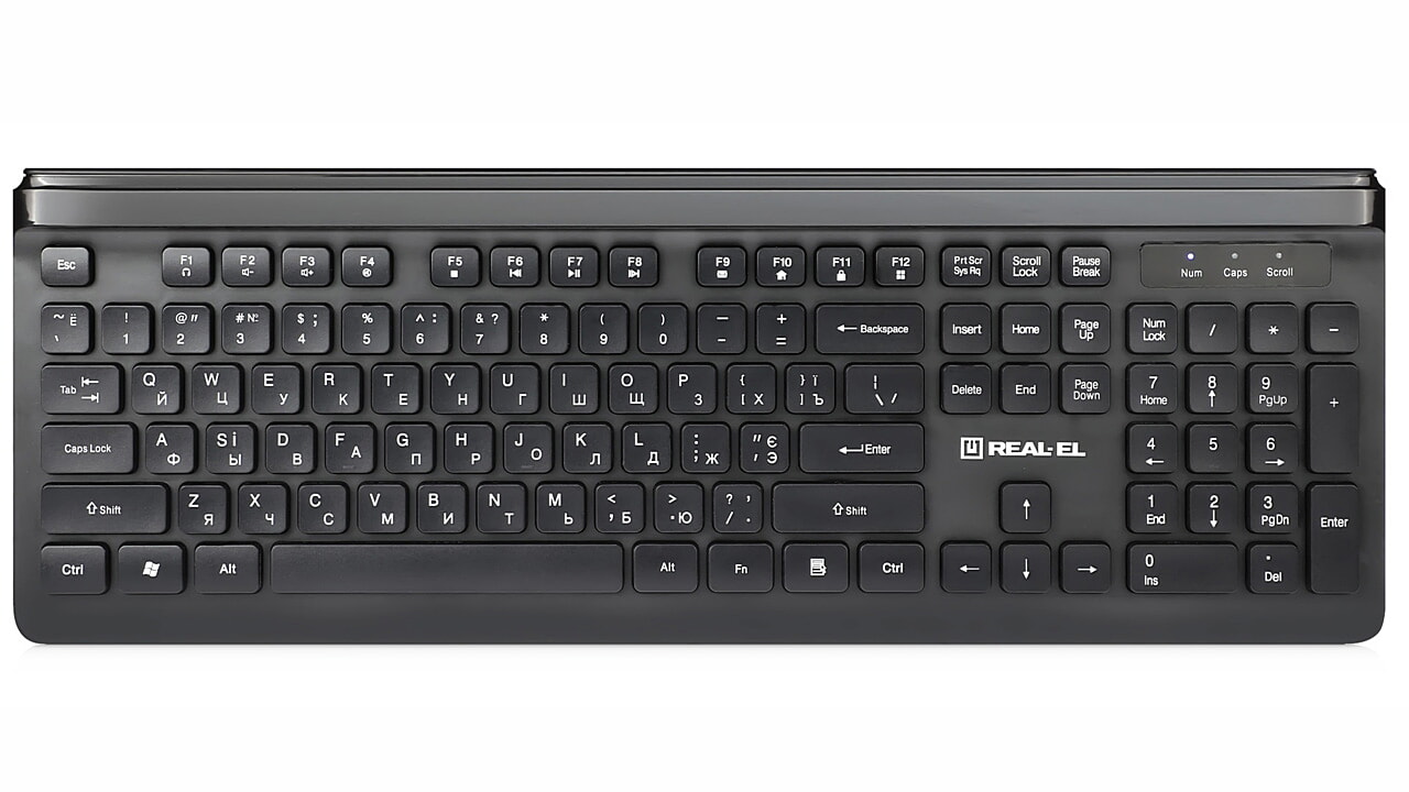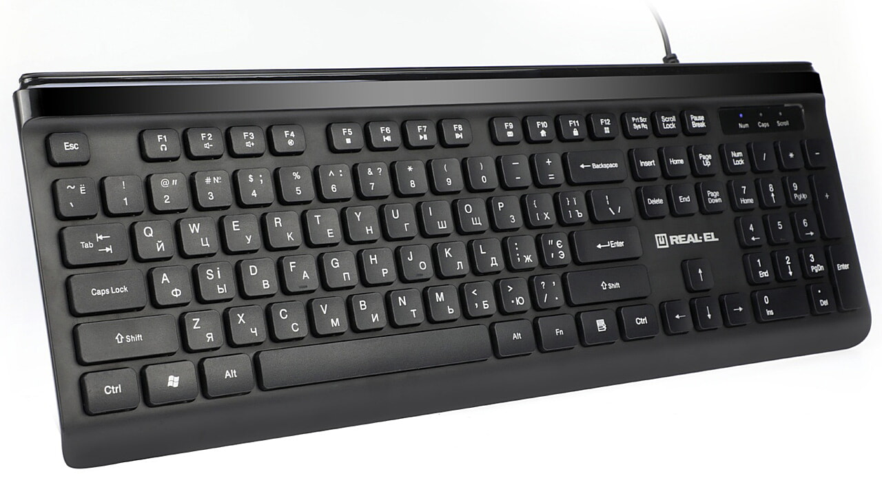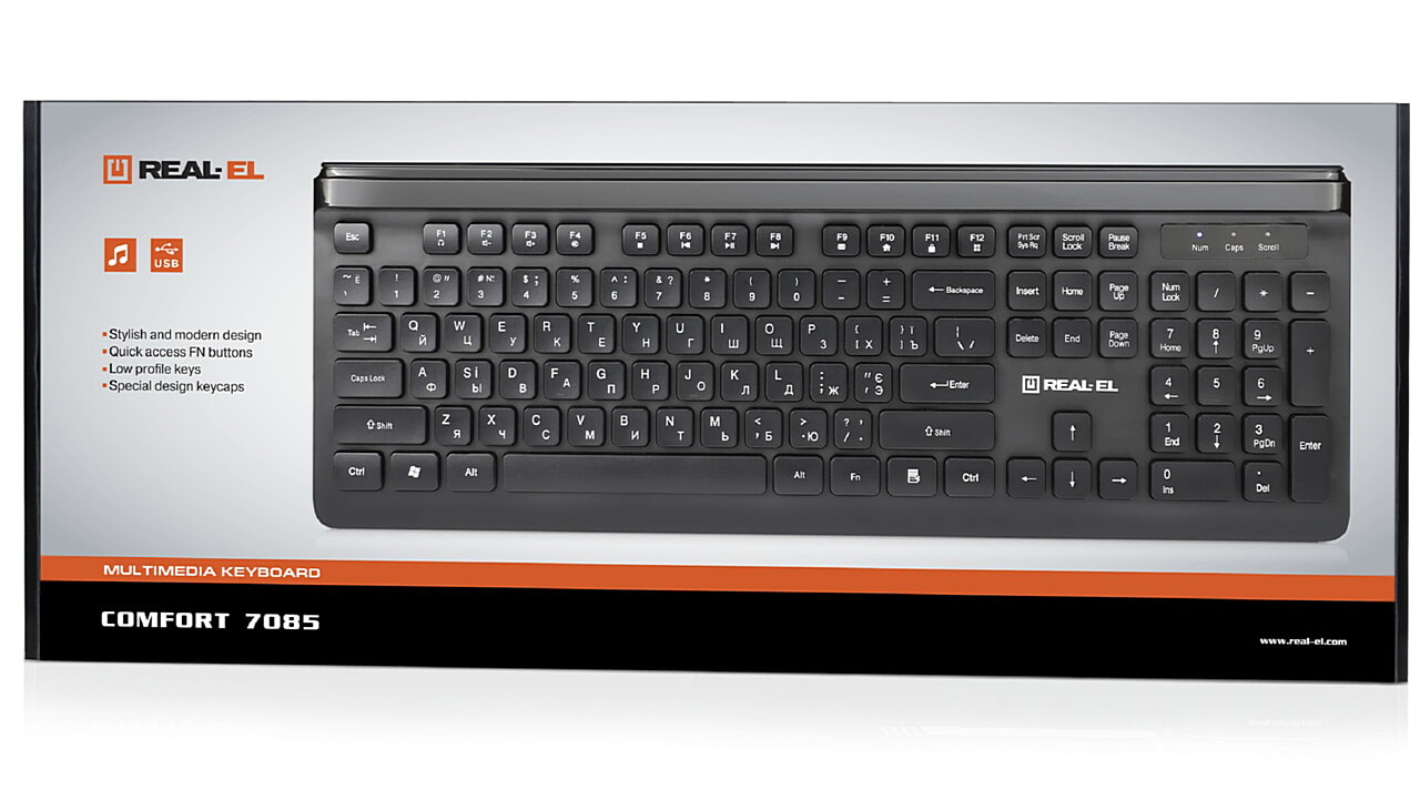Стильний і сучасний дизайн, кнопки швидкого доступу FN, низькопрофільні клавіші та спеціальний дизайн клавіш - особливості клавіатури REAL-EL Comfort 7085.