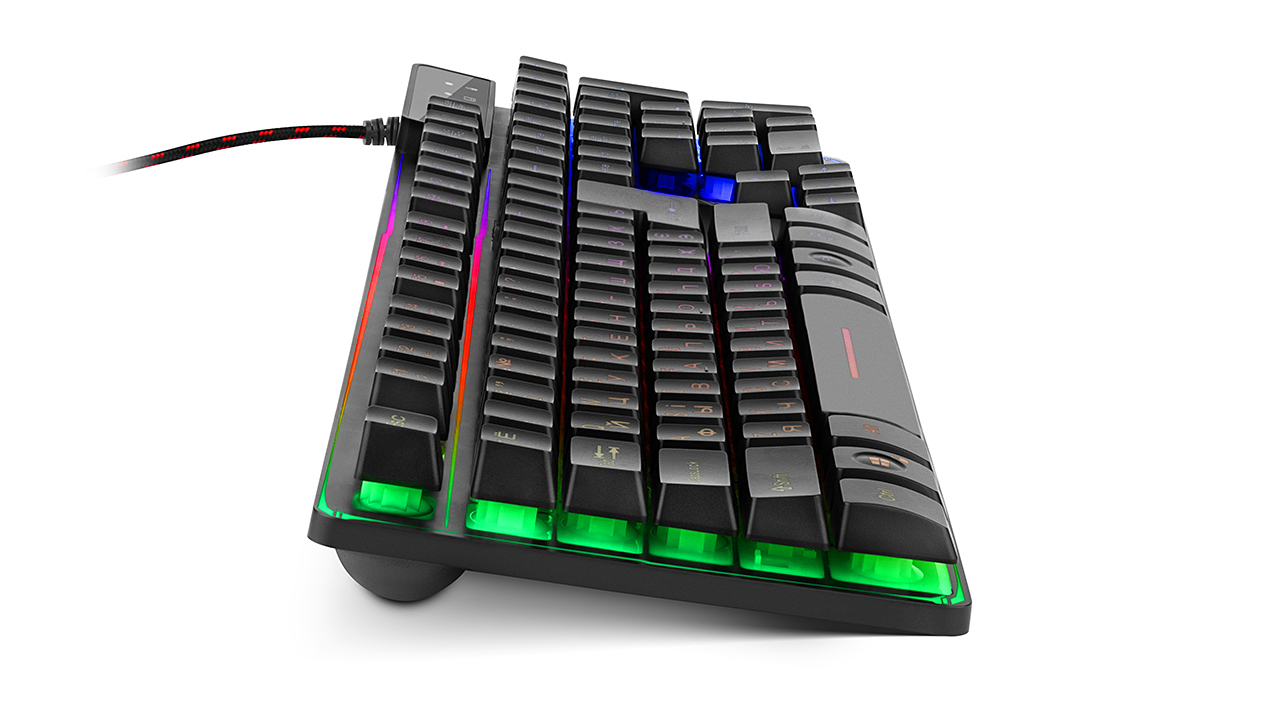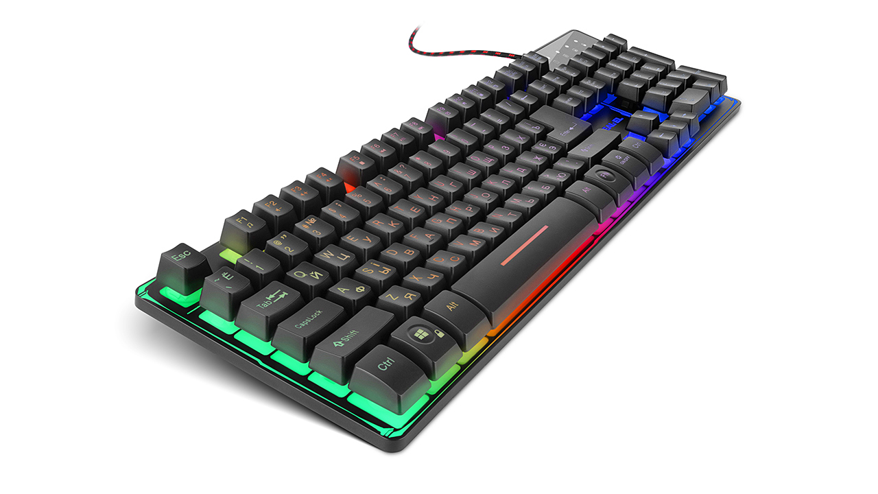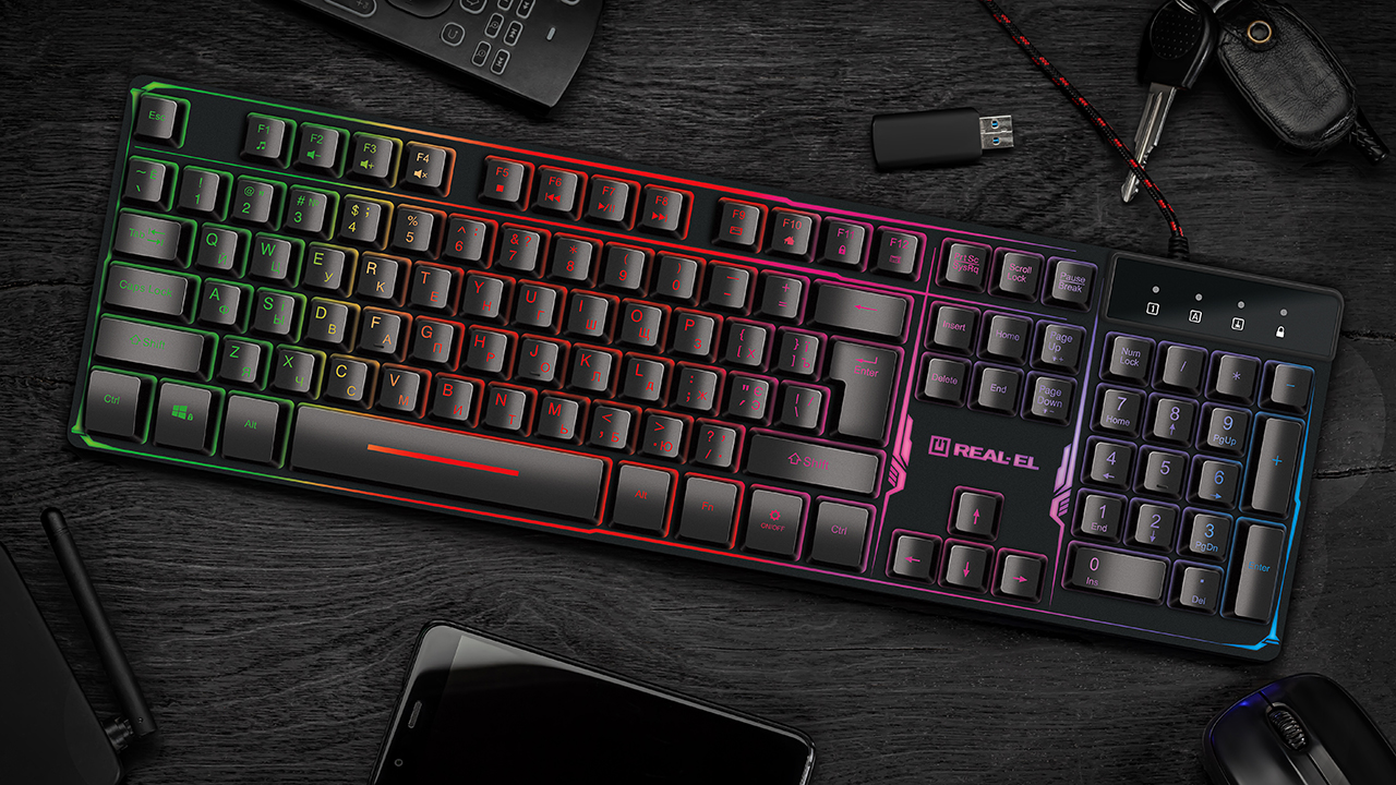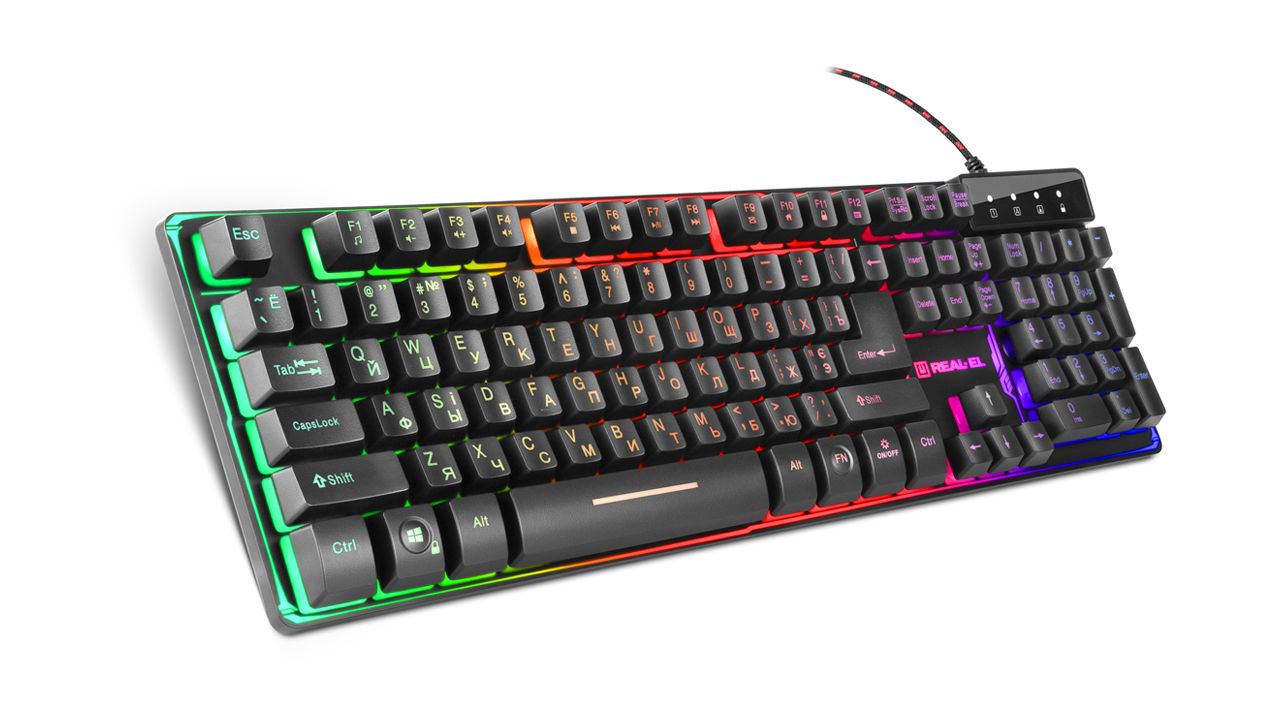 Особливості ігрової клавіатури з підсвічуванням клавіш REAL-EL GAMING 8700 Backlit: металева основа, високоякісна мембрана, сумісність з Windows XP/Vista/7/8/10, комфортний м'який хід клавіш, 12 Fn кнопок швидкого доступу до Windows, Інтернету та Мультимедіа, кабель в тканинному обплетенні. Багатокольорове підсвічування клавіш з різними режимами яскравості, наявність режиму "дихання".