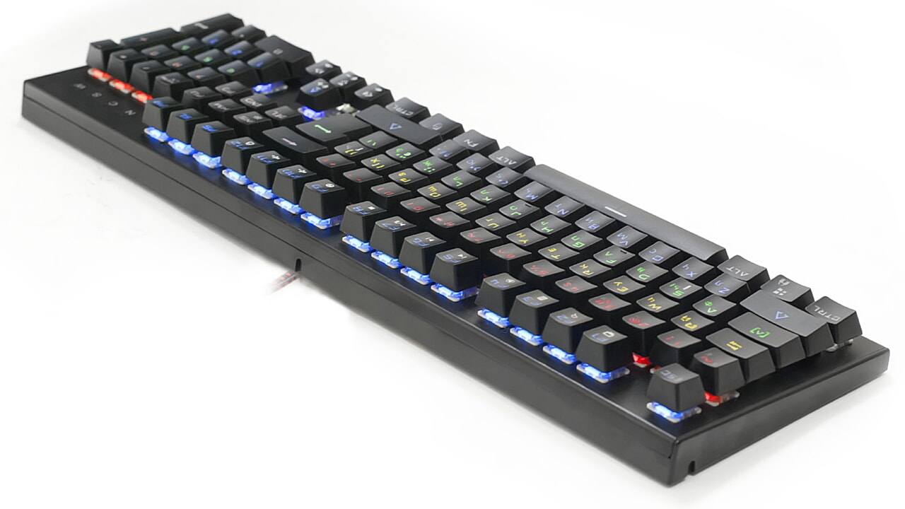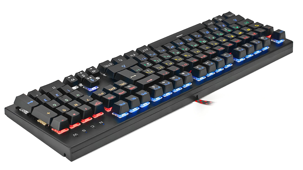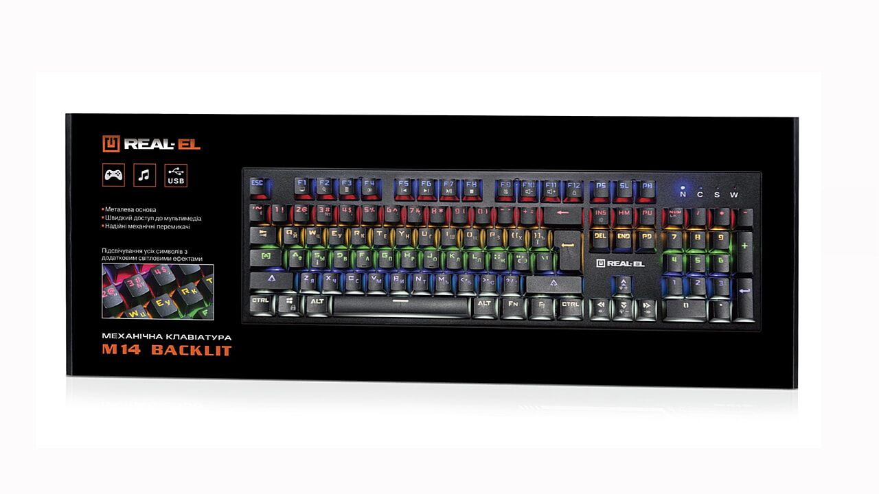 Особливості ігрової механічної клавіатури REAL-EL M14 Backlit: металева основа, NKRO, кабель менеджмент, підсвічування усіх символів з додатковим світловими ефектами, надійні механічні перемикачі (BLUE SWITCH) та 12 Fn кнопок швидкого доступу до Windows, Інтернету та Мультимедіа.