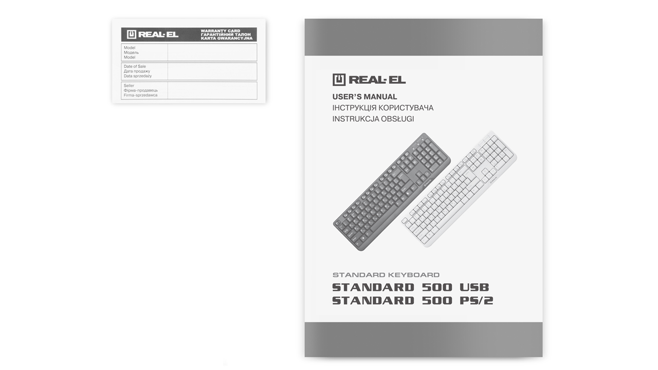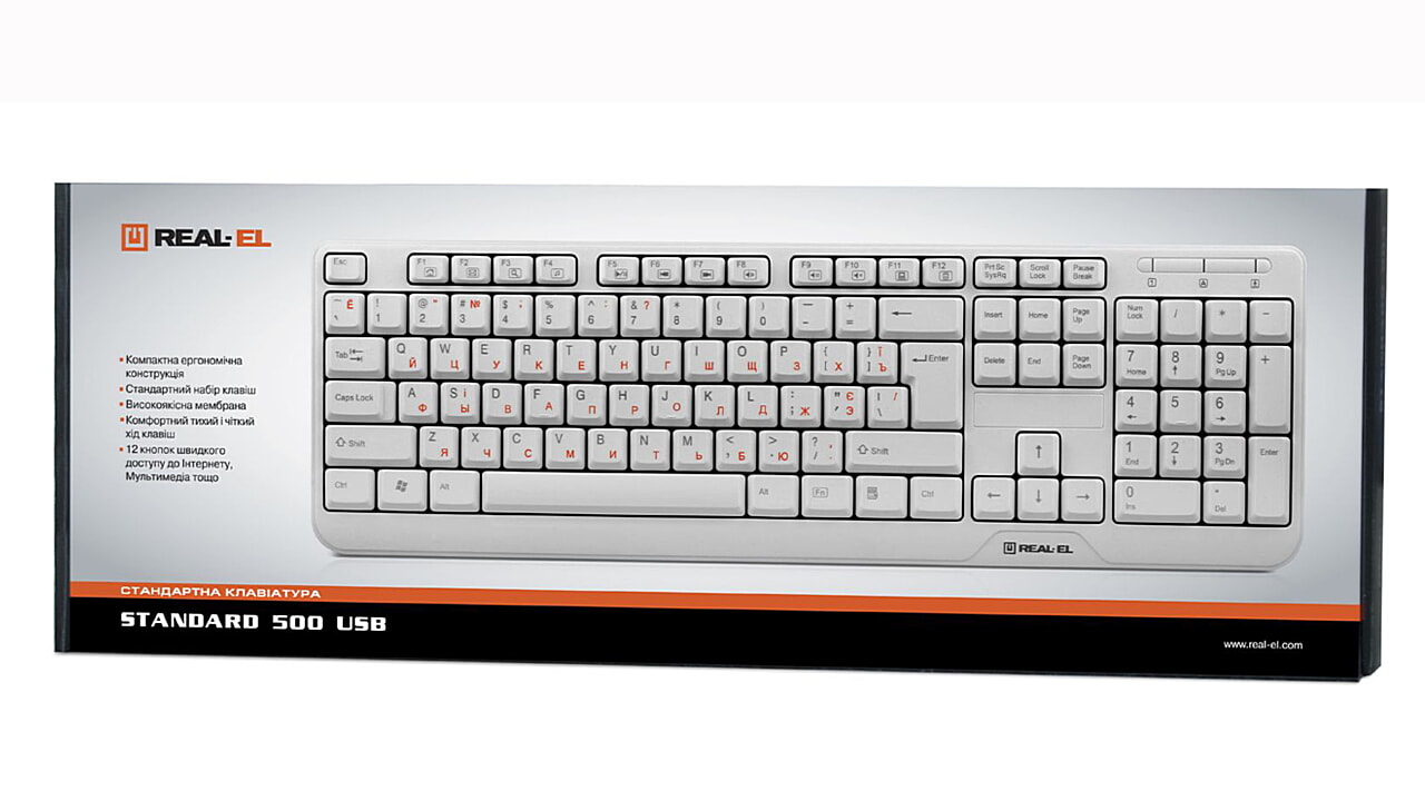 Клавіатура REAL-EL Standard 500 оснащена інтерфейсом USB або PS/2. Її інсталяція здійснюється автоматично після підключення до USB чи PS/2 порту ПК. Високоякісна мембрана і тихий хід клавіш забезпечують легке і м'яке натиснення кнопок. Модель для зручності оснащена клавішею швидкого доступу до калькулятора.