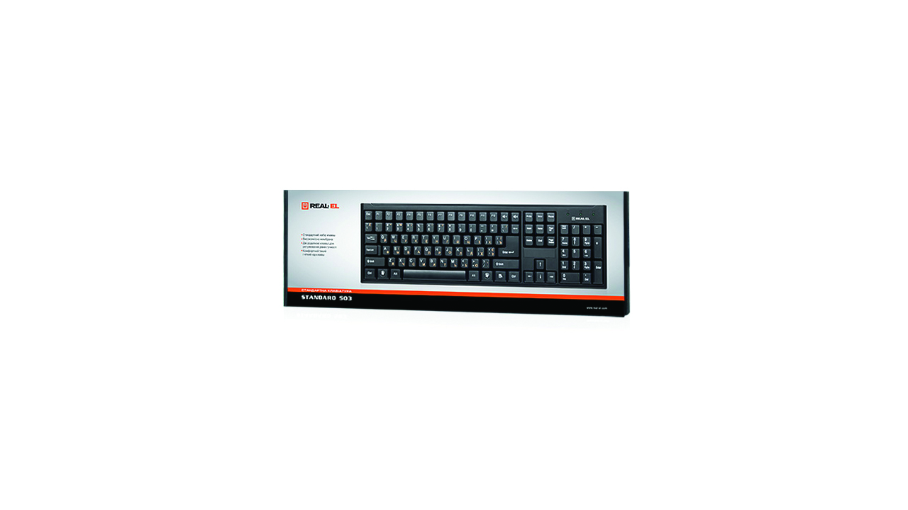 Сучасний компактний дизайн, стандартний набір клавіш, інтерфейс USB, 2 додаткові клавіші для регулювання рівня звуку, високоякісна мембрана, знижений шум під час роботи – особливості клавіатури  REAL-EL Standard 503.