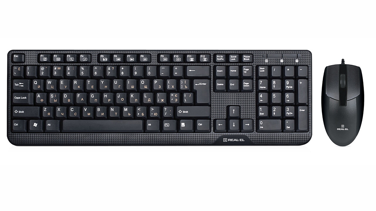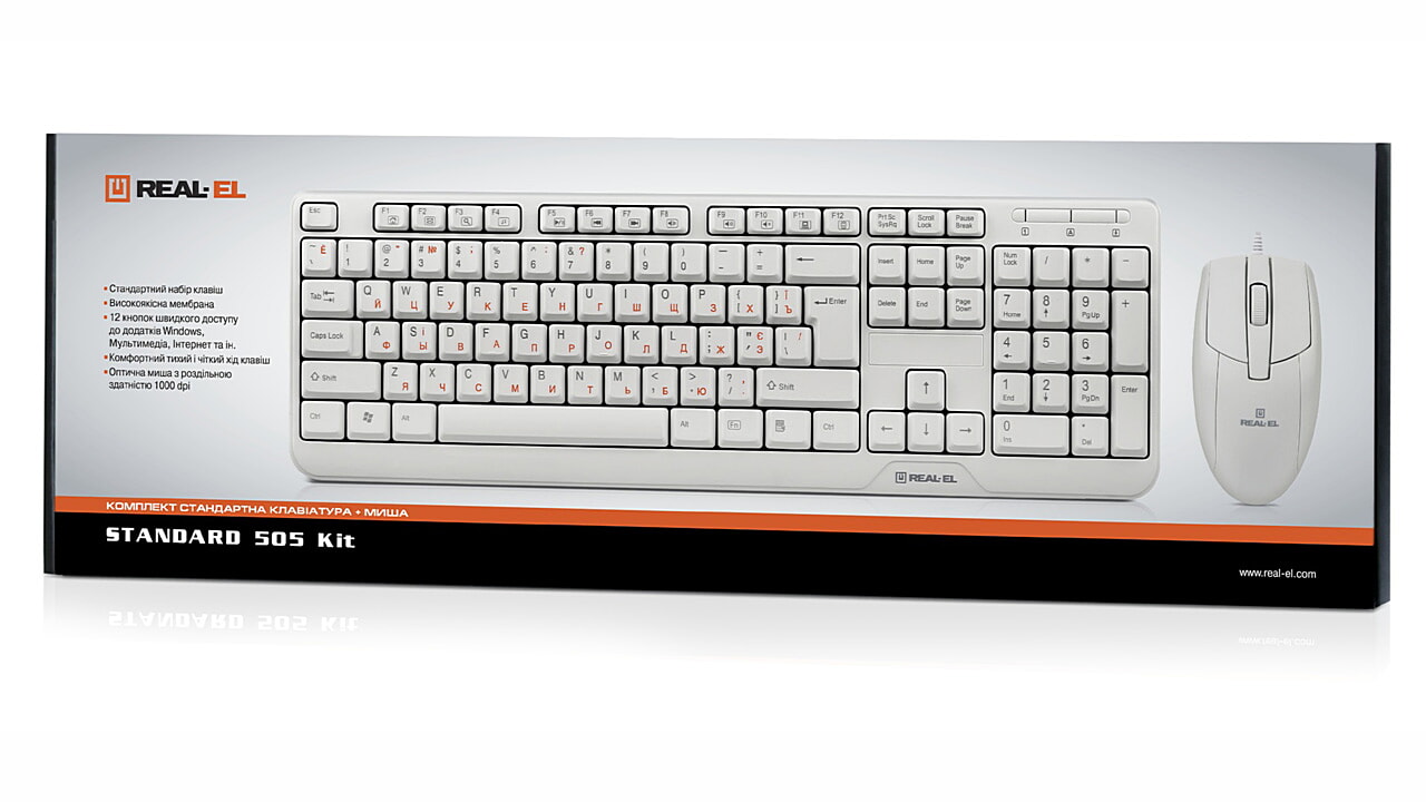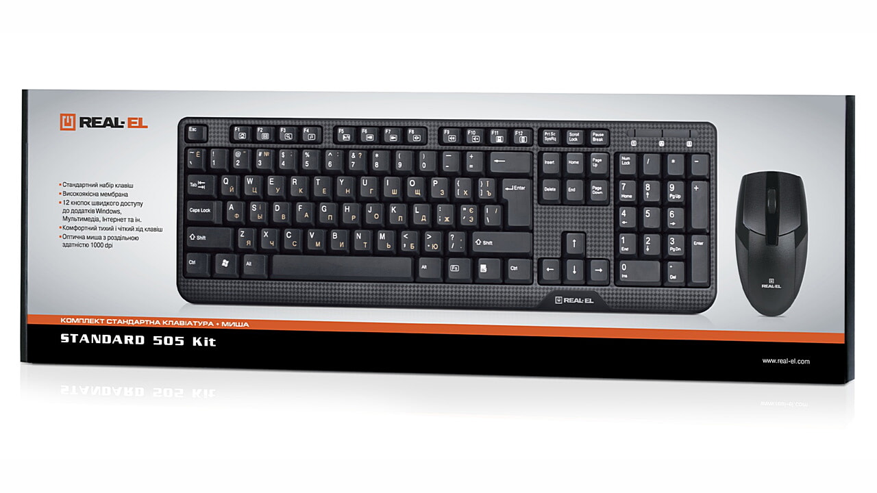 Ергономічний дизайн, стандартний набір клавіш, інтерфейс USB, 12 клавіш швидкого доступу, оптична миша з роздільною здатністю 1000 dpi, високоякісна мембрана, знижений шум під час роботи – особливості комплекту клавіатура + миша REAL-EL Standard 505 Kit.