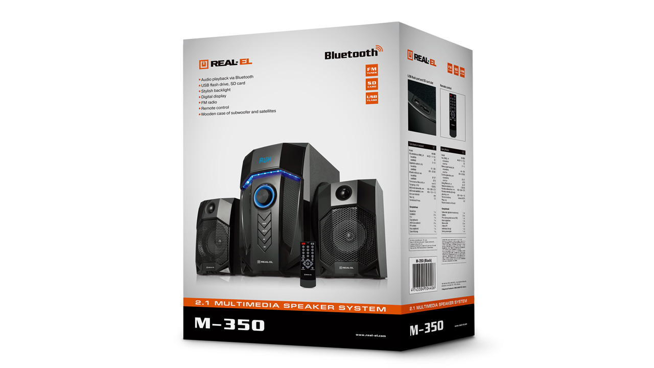 Мультимедійна акустична система 2.1 REAL-EL M-350 - це відмінне рішення для озвучування квартири або будинку. Колонки REAL-EL M-350 можуть бути підключені практично до будь-яких джерел аудіо сигналу і допоможуть Вам повною мірою насолодитися улюбленими фільмами, іграми, музикою або прослухати вподобану радіохвилю. Продуманий стильний зовнішній вигляд з підсвічуванням стане гармонійним доповненням дизайну Вашого приміщення. В акустичній системі передбачені всі сучасні опції: пульт дистанційного керування, вбудований Bluetooth-модуль і FM-радіо, програвач аудіо файлів з USB flash і SD card, сабвуфер і сателіти виготовлені з дерева (MDF).