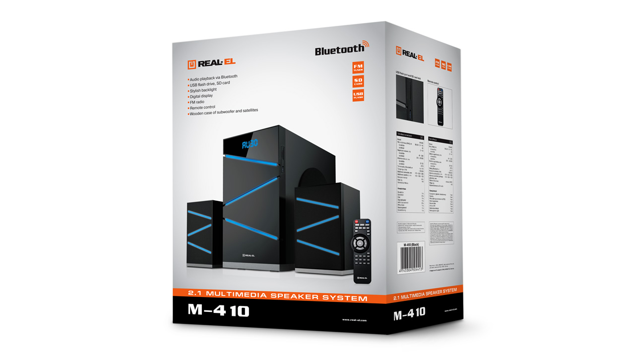 Колонки REAL-EL M-410 можуть бути підключені практично до будь-яких джерел аудіо сигналу і мають сучасні опції: пульт дистанційного керування, вбудований Bluetooth-модуль і FM-радіо, програвач аудіо файлів з USB flash і SD card.