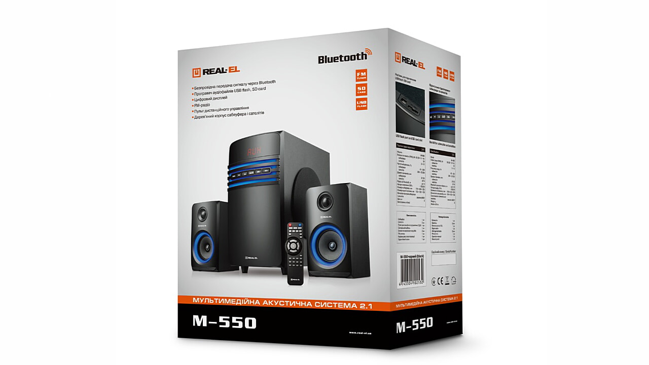 Мультимедійна акустична система 2.1 REAL-EL M-550 має широкий функціонал поєднаний з сучасним дизайном. Сабвуфер в дерев'яному корпусі додасть низьких частот і розширить діапазон відтворення, а також посилить спецефекти в іграх і фільмах. У даній моделі є все необхідне - вбудоване FM-радіо, роз'єми для підключення USB Flash і SD-card, модуль Bluetooth, вбудований програвач аудіофайлів, зручний пульт управління і навіть інформативний LED-дисплей.