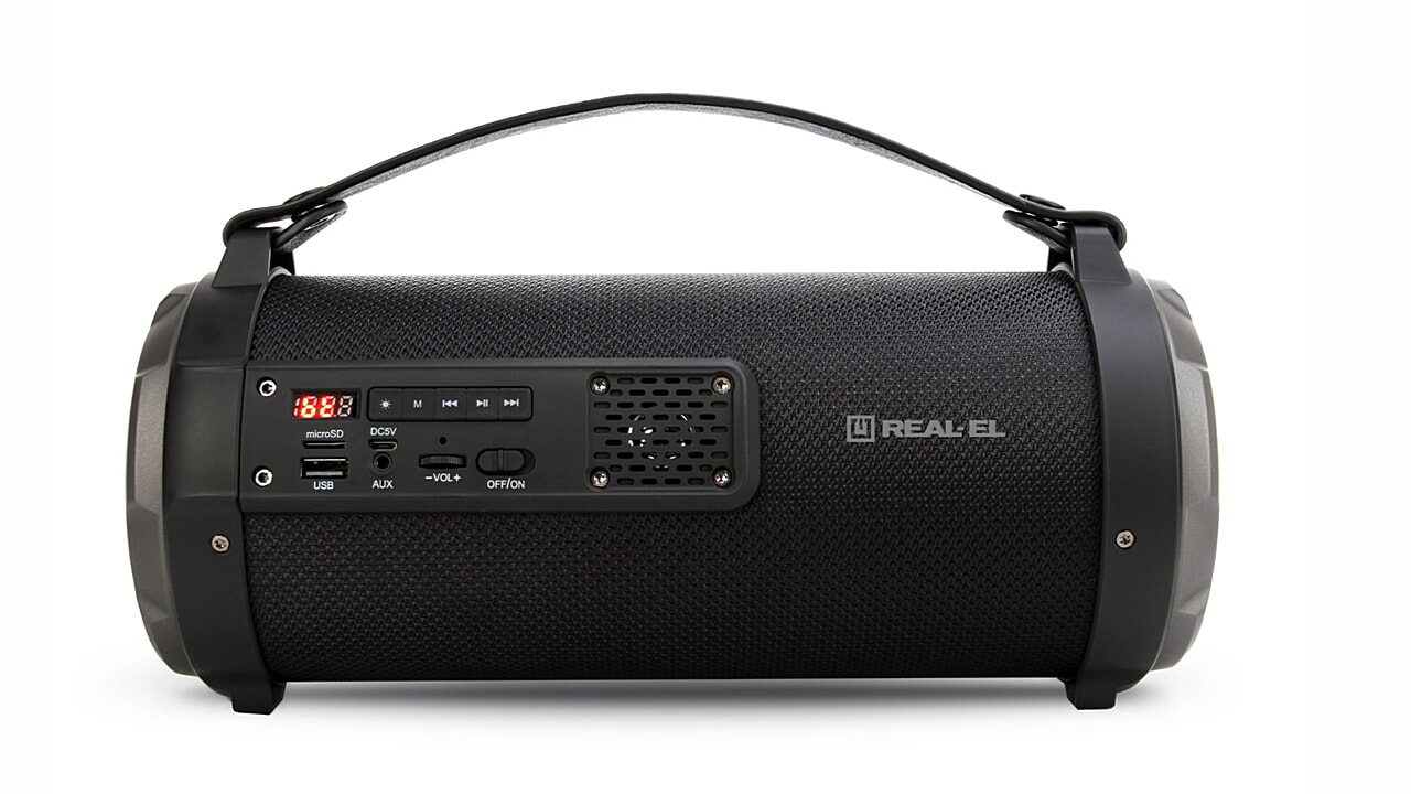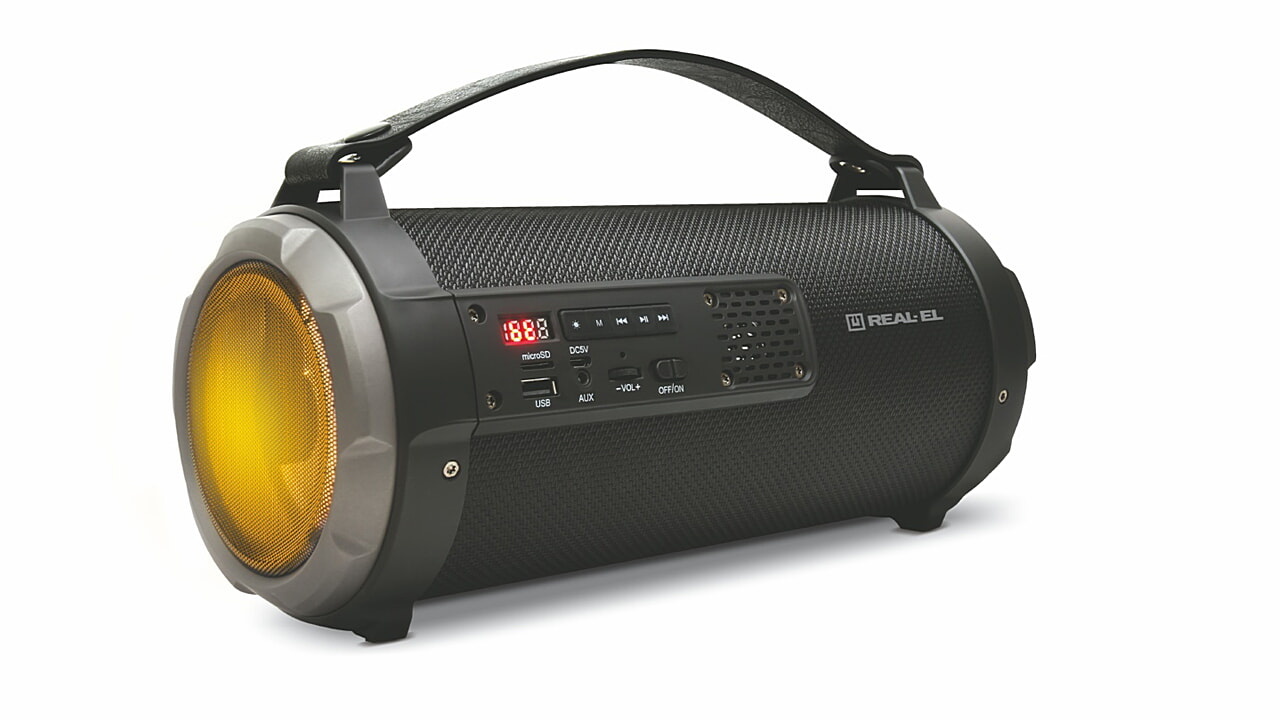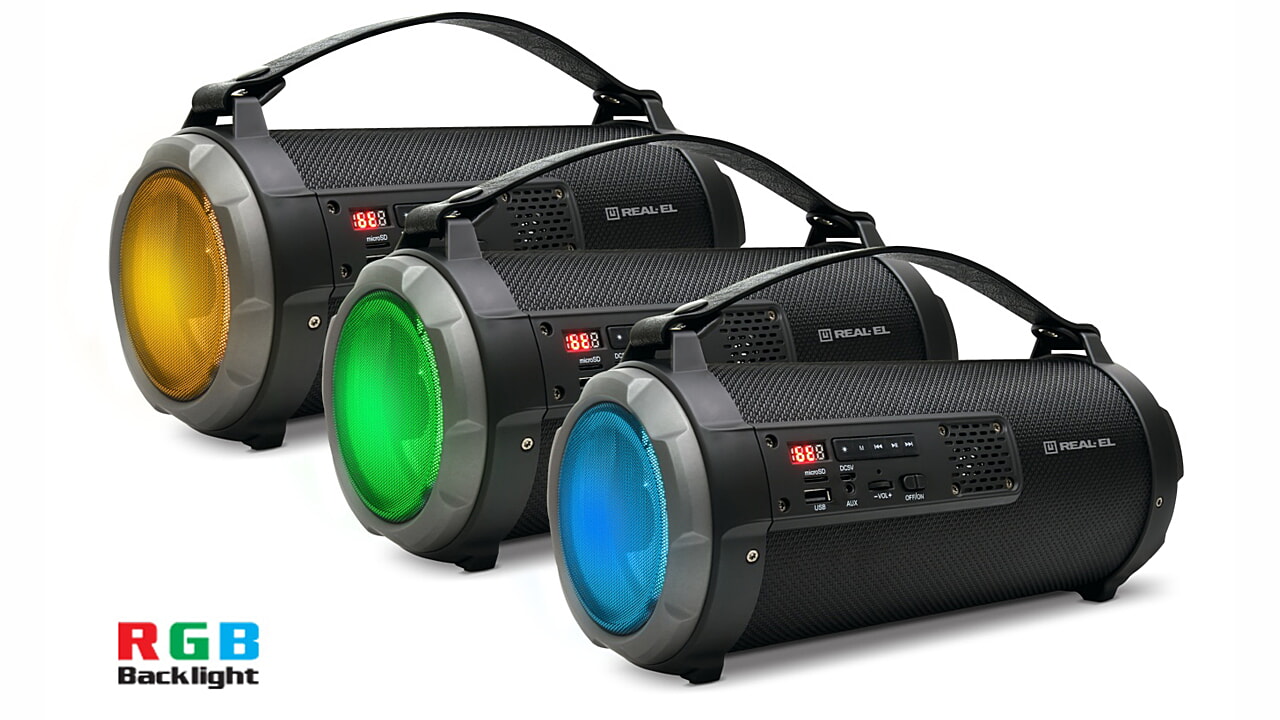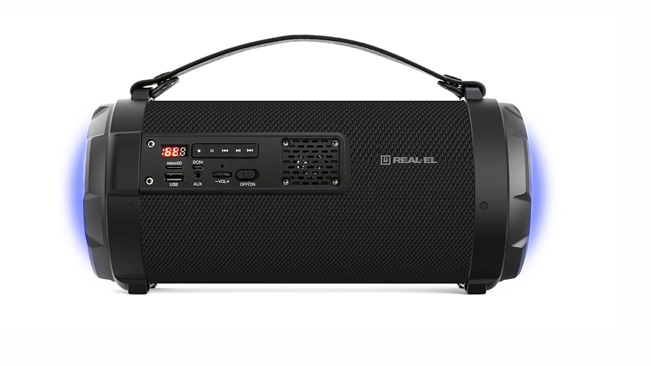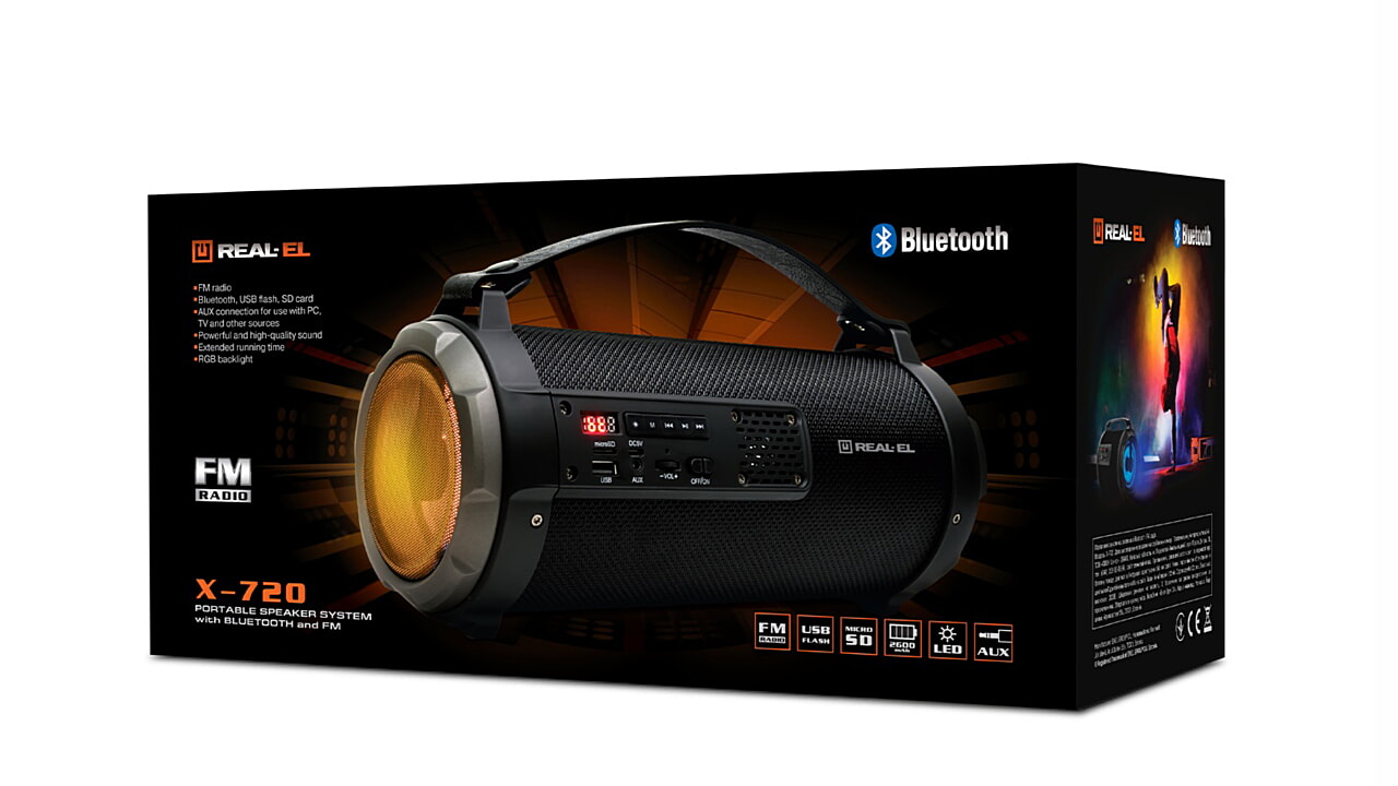 портативна акустична система REAL-EL X-720 має сучасний дизайн з яскравим RGB підсвічуванням і якісним звучанням. Широкий функціонал "бумбокса" дозволяє прослуховувати музику підключаючи мобільний пристрій, ПК, TV, ноутбуки і т. п., як через вивід AUX, так і по Bluetooth. USB і Micro SD card роз'єми дають можливість прослуховувати аудіо-файли з flash носіїв. X-720 відмінний супутник для відпочинку на природі, літій-іонний акумулятор на 2600 mAh забезпечить вас музикою на вельми тривалий час.