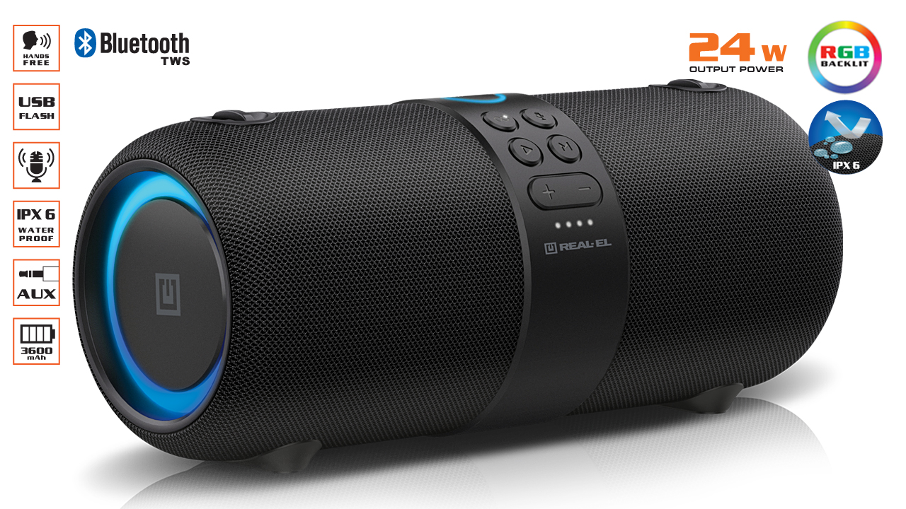 REAL-EL X-735 відмінний супутник для відпочинку на природі та вулиці у будь-яку погоду, IPX6 захист дозволяє насолоджуватись прослуховуванням навіть під час дощу.