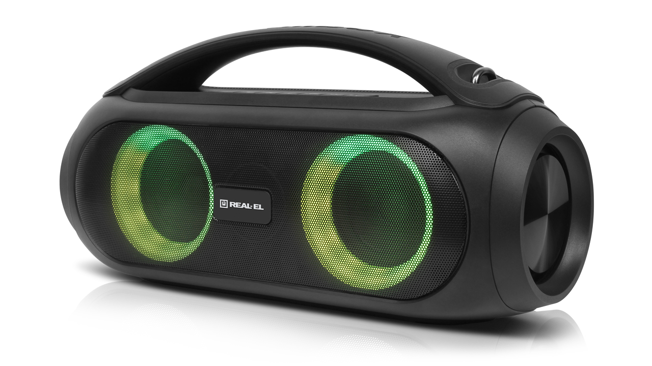 REAL-EL X-745 це стильний, потужний бумбокс з RGB підсвічуванням, функцією TWS та вбудованим еквалайзером.