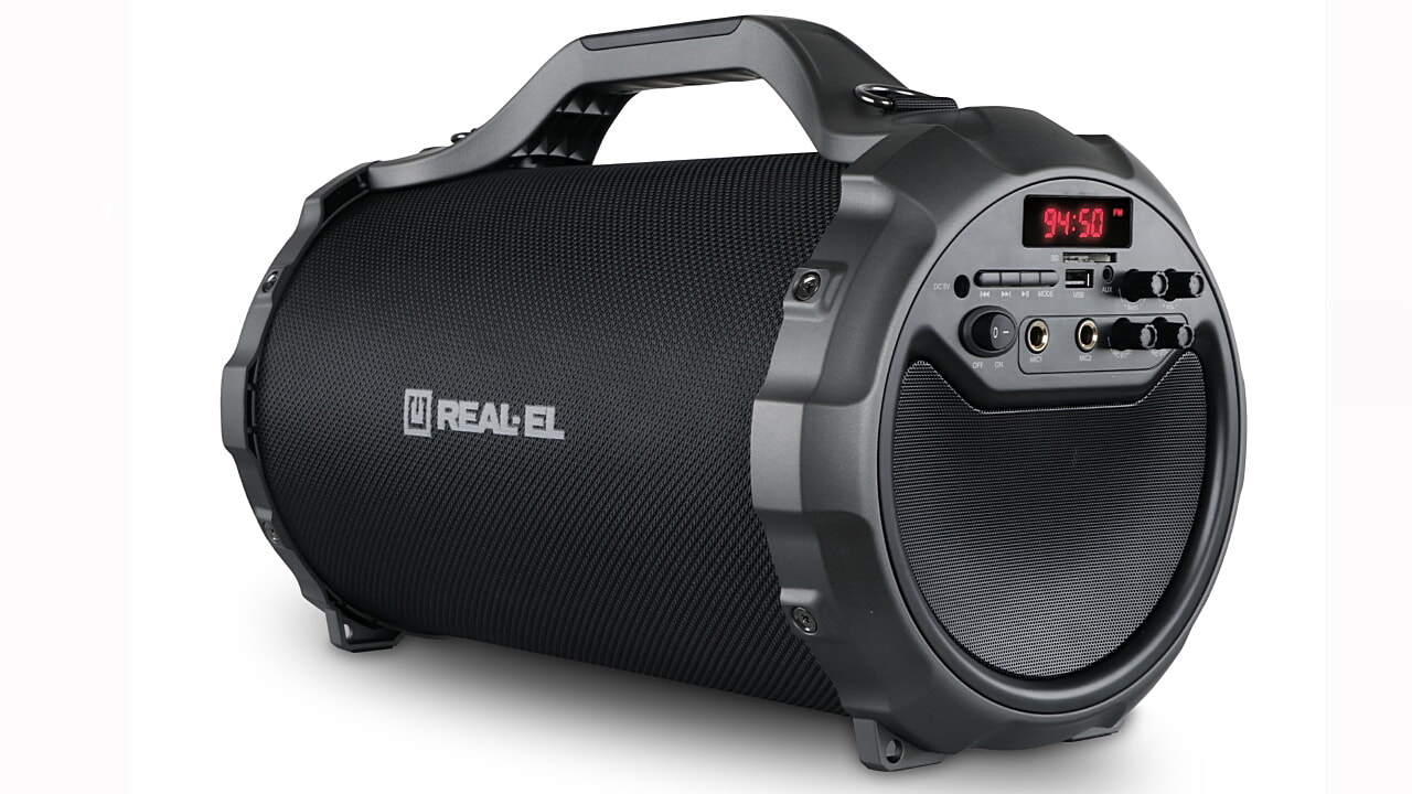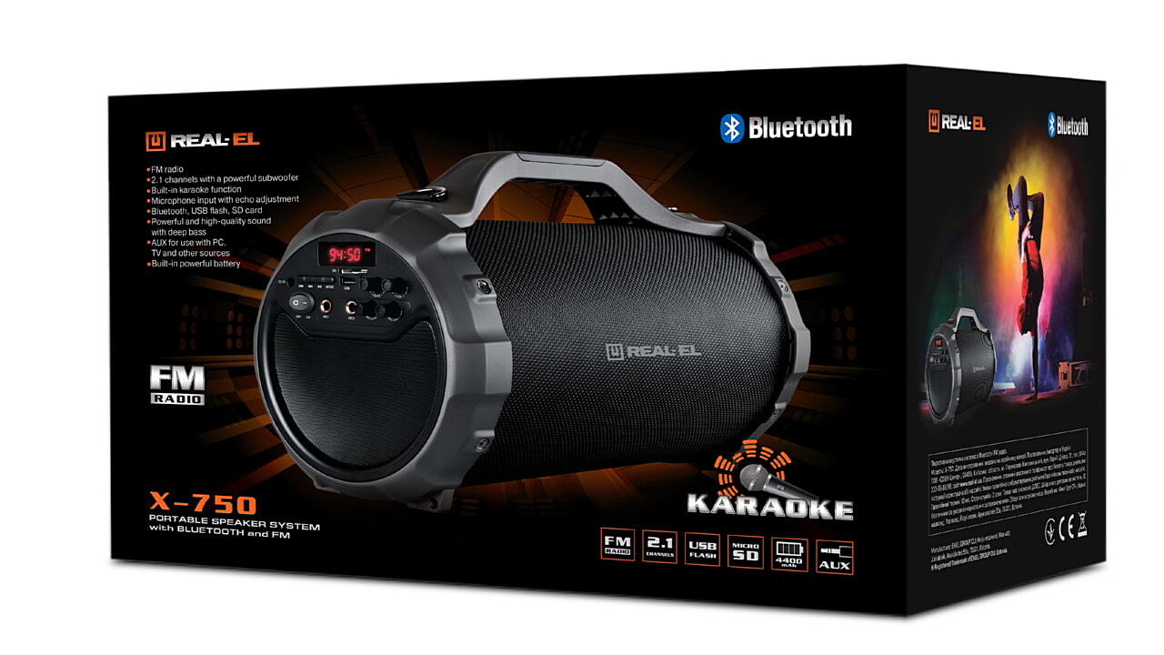 Мультимедійна портативна акустична система REAL-EL X-750 має сучасний дизайн і гучне якісне звучання, яке забезпечується сумарною потужністю динаміків 36 Вт. Широкий функціонал "бумбокса" дозволяє прослуховувати музику підключаючи мобільний пристрій, ПК, TV, ноутбуки і т. п., як через вивід AUX, так і по Bluetooth. USB і SD card роз'єми дають можливість прослуховувати аудіо-файли з flash носіїв. Пристойну тривалість роботи забезпечує літій-іонний акумулятор на 4400 mAh. X-750 відмінний супутник для відпочинку на природі, а для любителів КАРАОКЕ є два мікрофонних роз'єми з функцією відлуння.