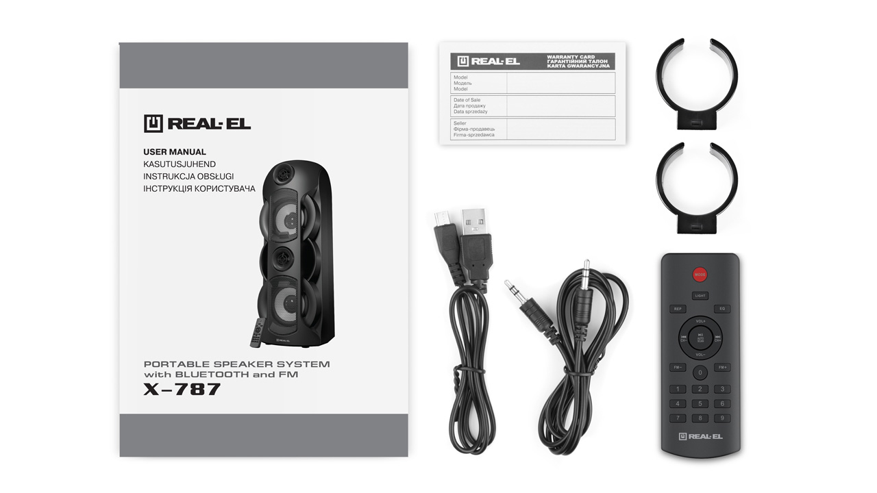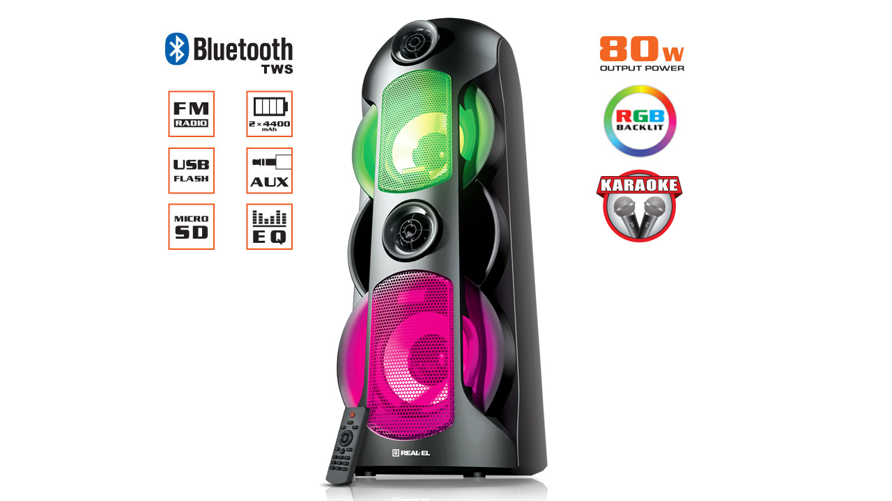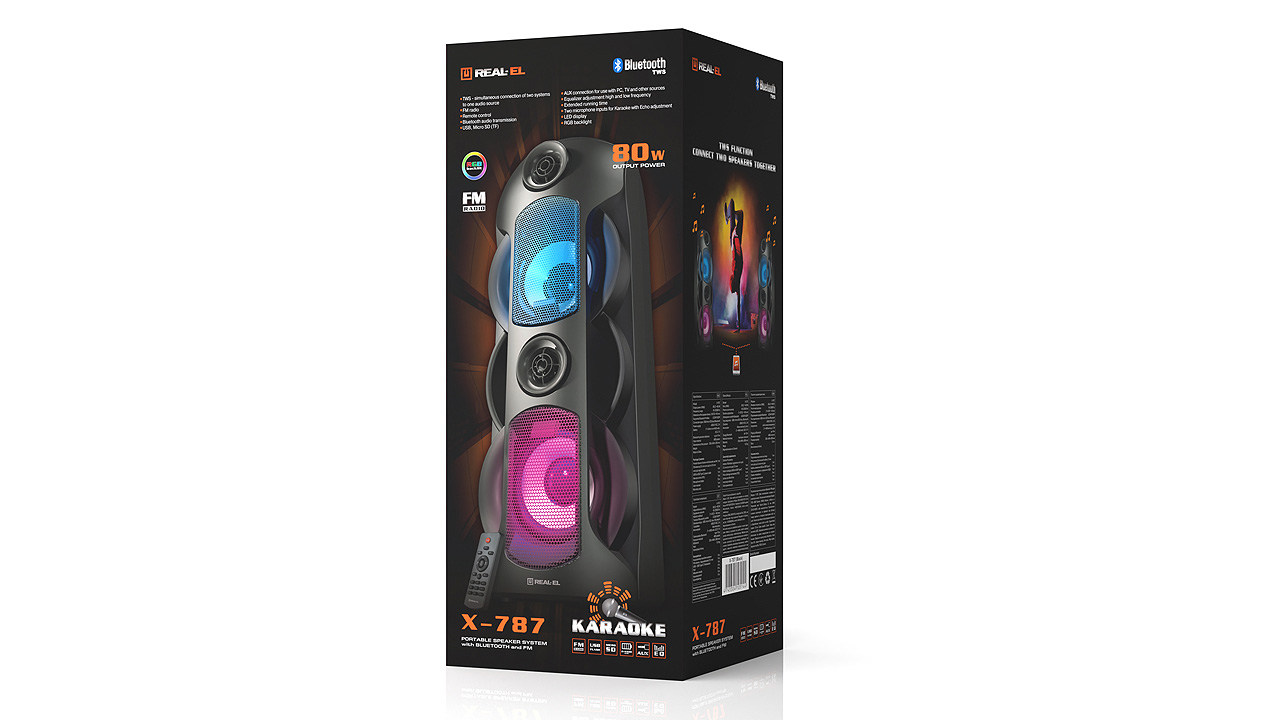 Мультимедійна портативна акустична система REAL-EL X-787 має сучасний дизайн з RGB підсвічуванням і якісним потужним 80-ти Ватт-ним звучанням. Широкий функціонал "бумбокса" дозволяє прослуховувати музику підключаючи мобільні пристрої, ПК, TV, ноутбуки і т. д., як через вивід AUX, так і по Bluetooth. USB і Micro SD card роз'єми дають можливість прослуховувати аудіо-файли з flash носіїв.