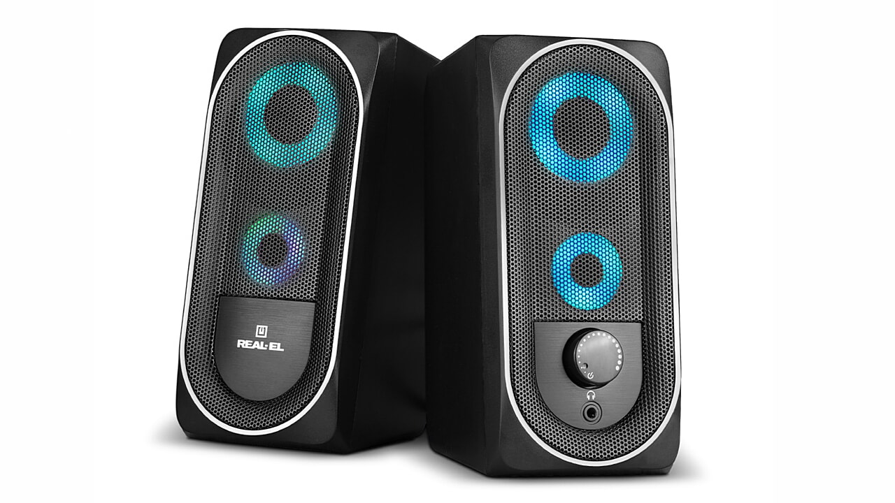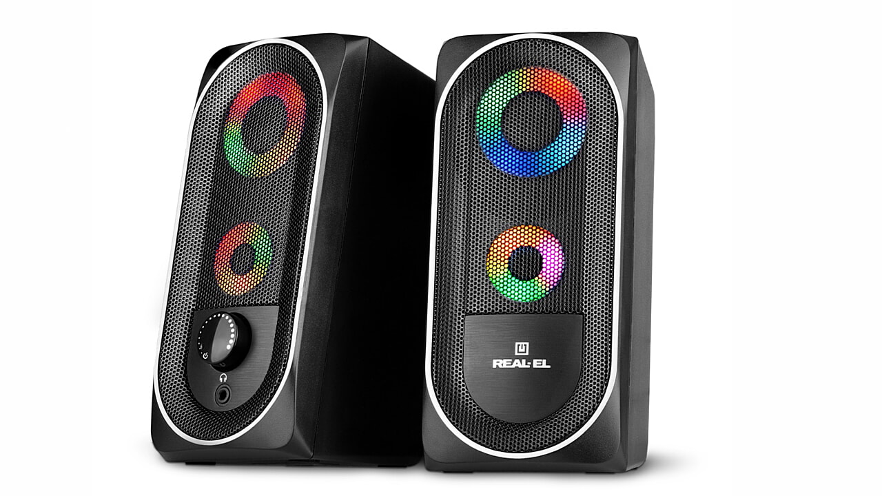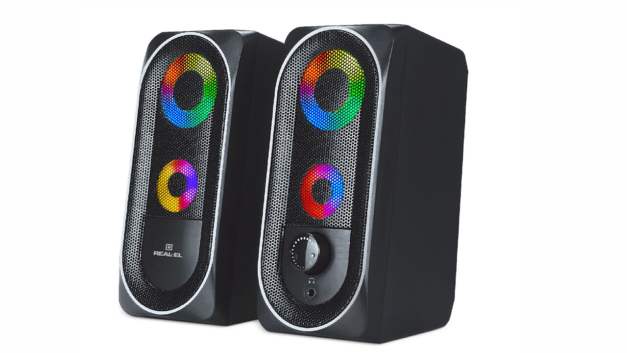 Мультимедійна акустична система REAL-EL S-110 – легке й доступне вирішення питання озвучування комп’ютера (ноутбука). АС оснащена вмонтованими підсилювачем, акустичним та сигнальним кабелями, завдяки чому може бути підключена практично до будь-яких джерел аудіосигналу. Живлення АС здійснюється через USB-порт ПК, ноутбука або блок 5V DC за допомогою вмонтованого USB-кабелю живлення.