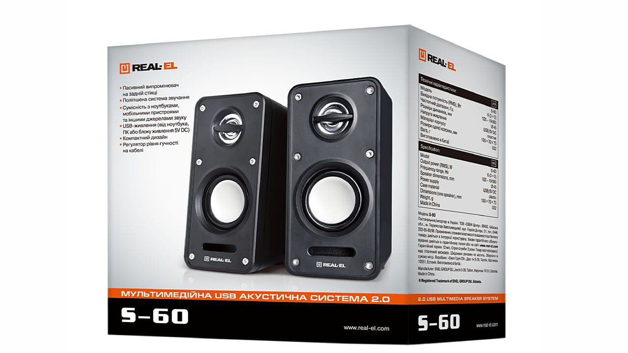 Мультимедійна USB акустична система REAL-EL S-60 – легке й доступне вирішення питання озвучування Вашого комп’ютера (ноутбука). АС сумісна з мобільними пристроями та іншими джерелами звуку.