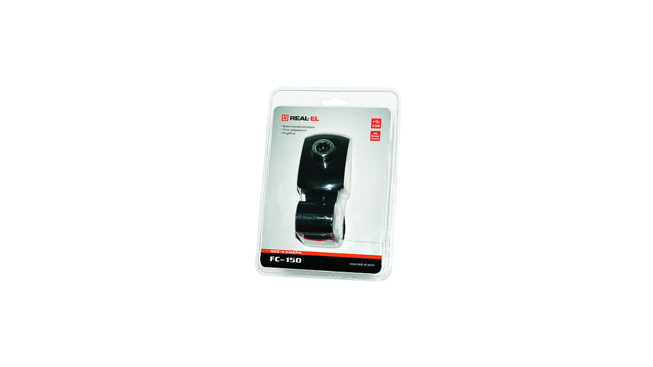 Веб-камера REAL-EL FC-150 має такі особливості: вмонтований мікрофон, настроювана фокусна відстань, захоплення фото одним натисненням кнопки, кульковий шарнір для повороту камери під будь-яким кутом, кліпса для установки камери на столі, ноутбуку або LCD моніторі