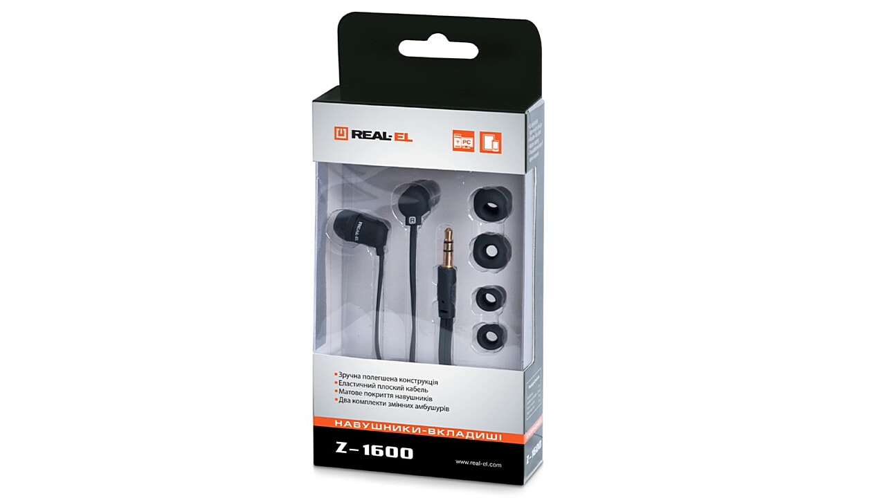 Навушники-вкладиші REAL-EL Z-1600 призначені для роботи із звуковими картами ПК та іншими сумісними з ними системами (портативними програвачами, комп’ютерними ігровими приставками тощо).