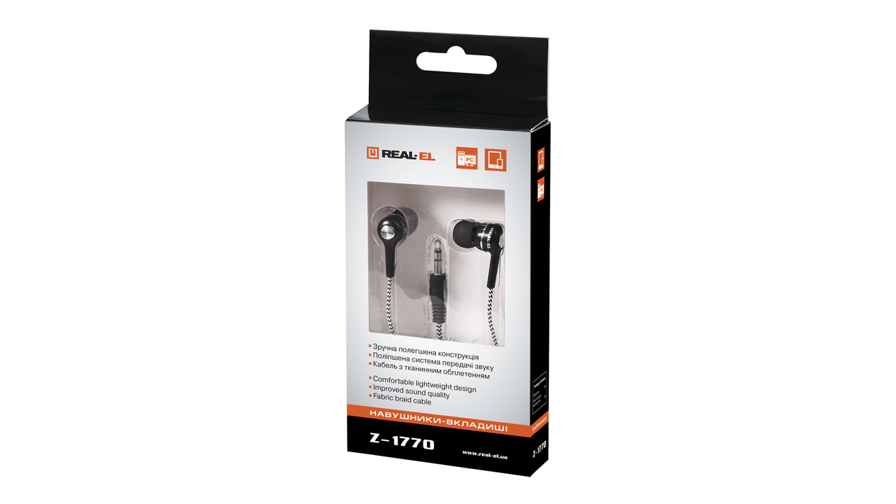 Навушники-вкладиші REAL-EL Z-1770 призначені для роботи із звуковими картами ПК та іншими сумісними з ними системами (портативними програвачами, комп’ютерними ігровими приставками тощо).