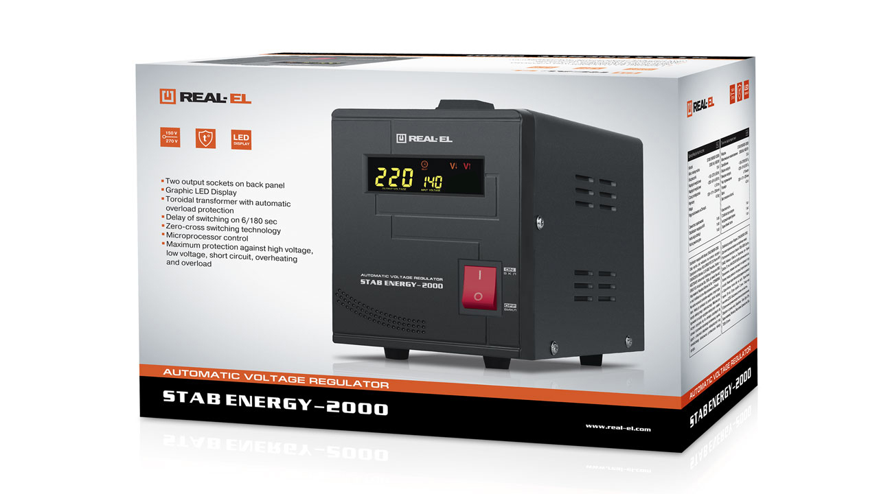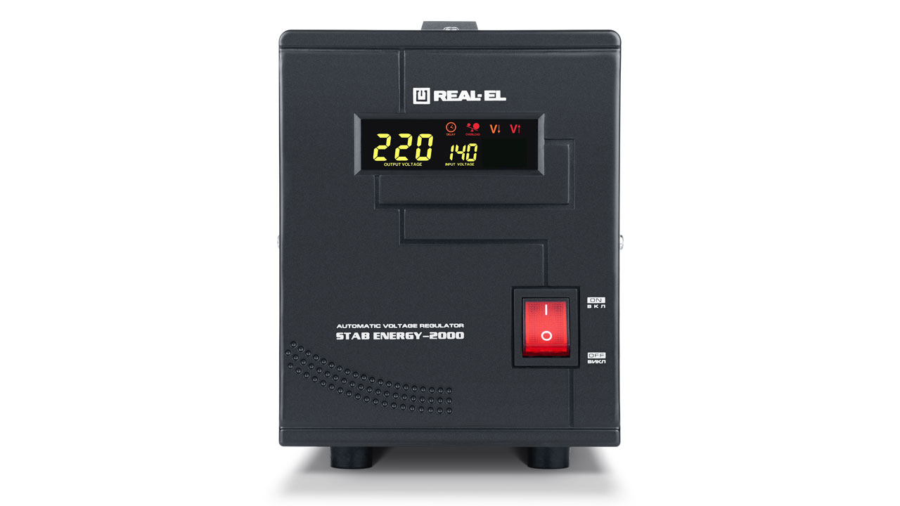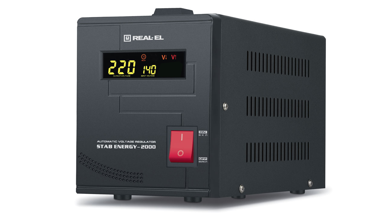 Стабілізатор напруги мережі REAL-EL STAB ENERGY-2000 призначено для забезпечення якісним і стабільним електроживленням різних споживачів в умовах великих за значенням та тривалістю відхилень напруги електричної мережі від номінальної, захисту пристроїв-споживачів від перевантаження, від дії високочастотних та імпульсних перешкод.