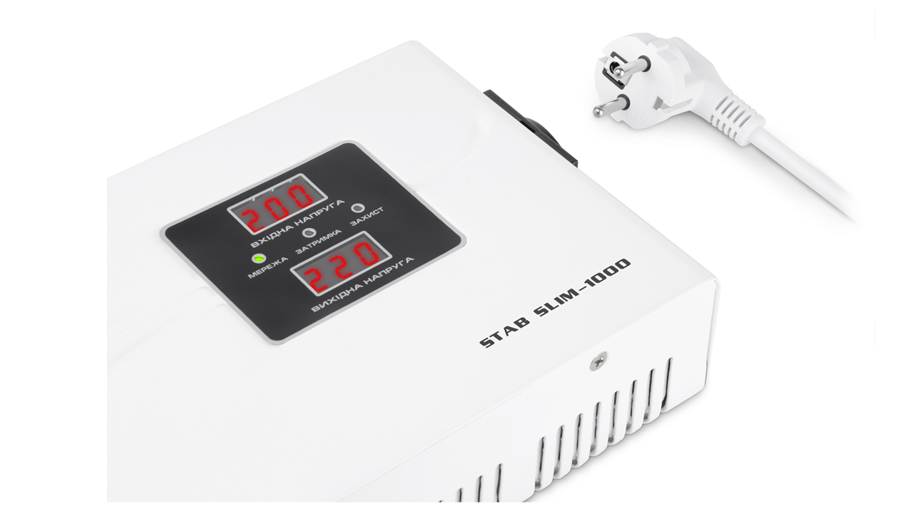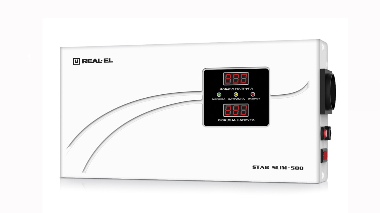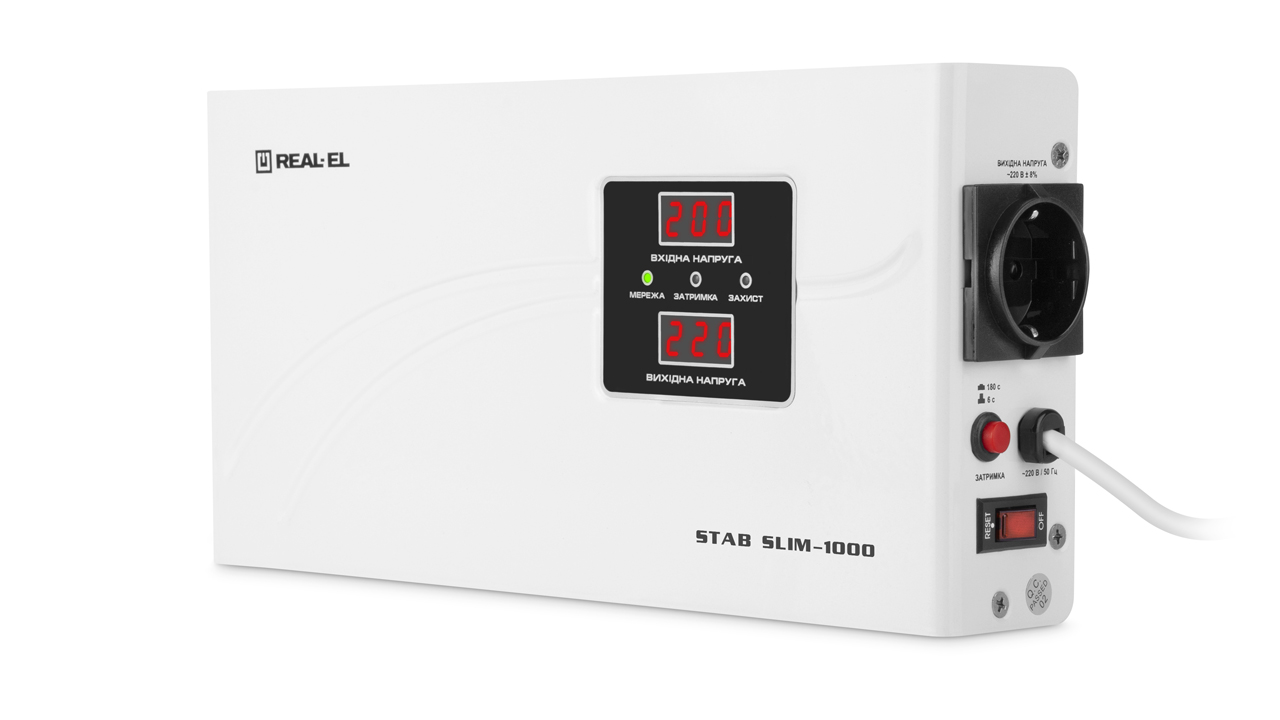 Стабілізатор напруги REAL-EL STAB SLIM-1000 призначено для забезпечення якісним і стабільним електроживленням різних споживачів, захисту пристроїв-споживачів від неприпустимих відхилень живлячої напруги, високочастотних та імпульсних перешкод, від перевантаження і КЗ.