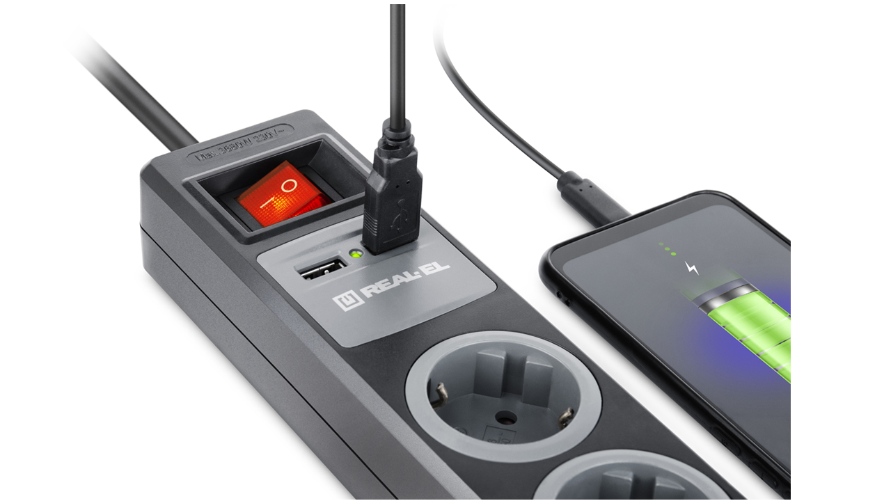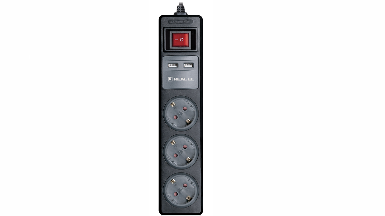 Мережевий подовжувач REAL-EL RS-3 USB Charge з вмонтованим USB зарядним пристроєм призначено для підключення до електричної мережі електроприладів та одночасного заряджання двох пристроїв. Має 3 розетки із заземленням та захисними шторками та 2 USB-порти для заряджання.