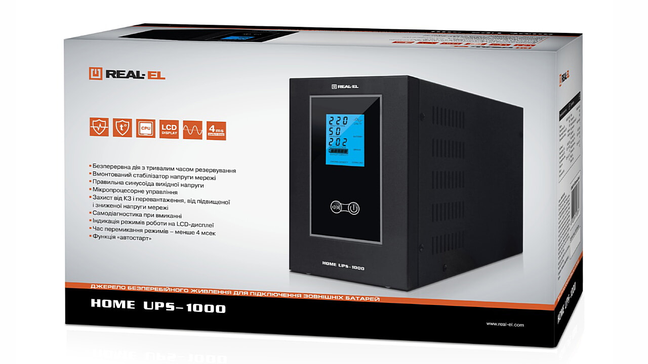 Лінійно-інтерактивне ДБЖ безперервної дії з тривалим часом резервування для підключення зовнішніх батарей REAL-EL HOME UPS-1000 призначено для експлуатації зі свинцево-кислотними необслуговуваними акумуляторними батареями типу AGM з напругою 12 В. Принцип його дії засновано на перетворенні постійного струму зовнішніх батарей у змінний. Форма струму на виході – правильна синусоїда.