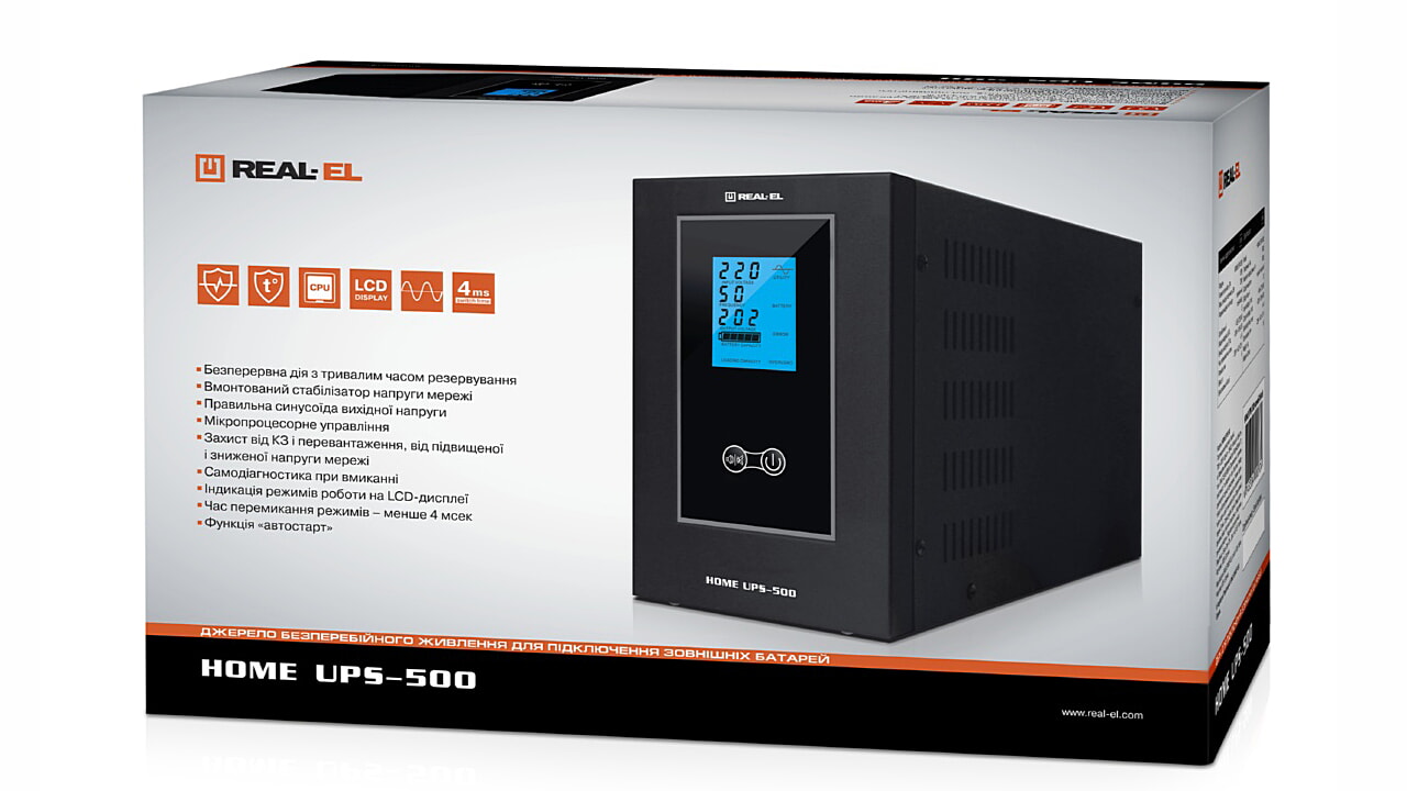 Лінійно-інтерактивне ДБЖ безперервної дії з тривалим часом резервування для підключення зовнішніх батарей REAL-EL HOME UPS-500 призначено для експлуатації зі свинцево-кислотними необслуговуваними акумуляторними батареями типу AGM з напругою 12 В. Принцип його дії засновано на перетворенні постійного струму зовнішніх батарей у змінний. Форма струму на виході – правильна синусоїда.