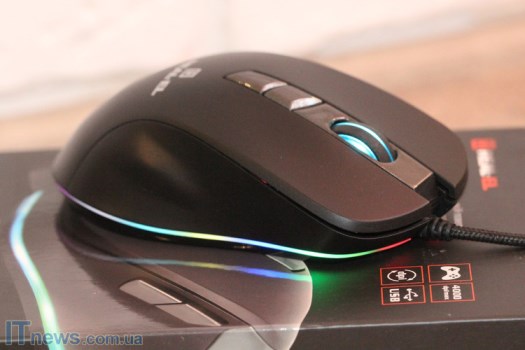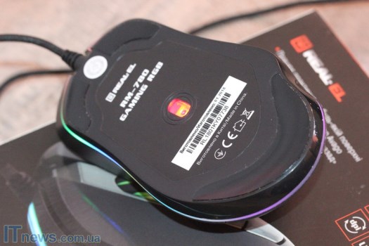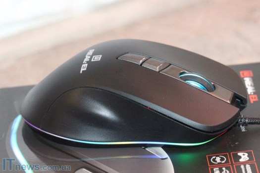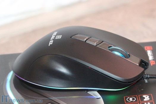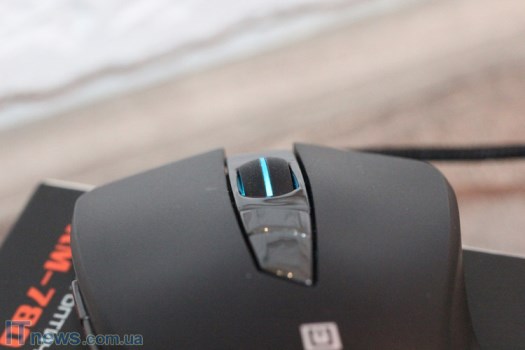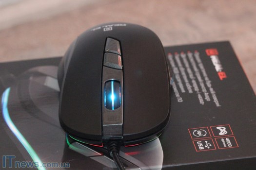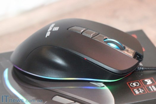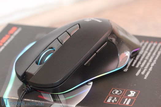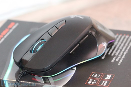 Підсвічування тут доречне в якості елементу дизайну. Крім того, воно вдало доповнює саму конструкцію (якщо можна так сказати), а ще класно підкреслюється імідж геймера. Підсвічується контур знизу і коліщатко. Колір підсвічування коліщатка змінюється при перемиканні dpi. Маніпулювати контурним підсвічуванням за допомогою кнопок у вас не вийде - тут тільки програмно. Однак, це тема наступного розділу огляду.