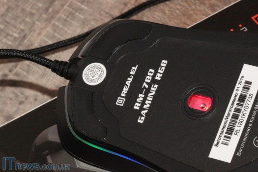 Корпус REAL-EL RM-780 Gaming – це поєднання матового і глянцевого пластика. Крім них, тут трохи гуми, а ще є тефлон і метал у вигляді окантовки USB-вилки. Кабель в тканинному обплетенні.