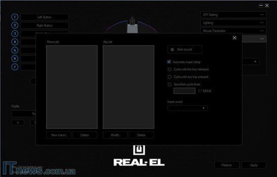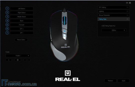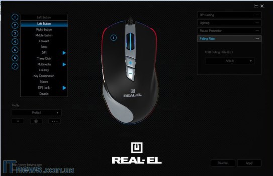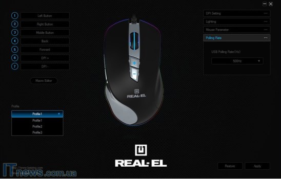 Фірмове ПЗ, котре виробник пропонує в якості безкоштовного, скажімо так, бонусу, дозволяє не тільки перелаштувати контурне підсвічування, але і також створити і зберегти кілька ігрових профілів (до чотирьох), регулювати dpi та багато іншого. Додаток простий, освоїти його нічого не варто, навіть якщо раніше ви не мали справ з ПЗ такого плану. Завантаження софту виконується звідси.