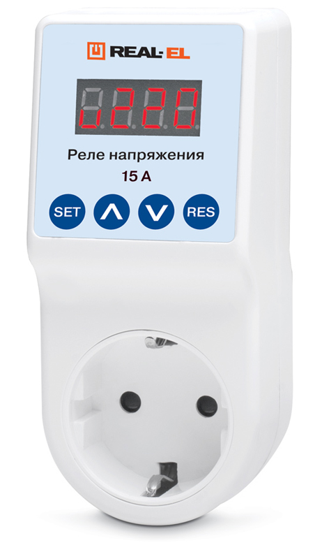Таке реле напруги встановлюється безпосередньо в розетку і використовується для захисту окремих споживачів або їх груп. Реле управляється мікроконтроллером, що здійснює аналіз поточної живлячої напруги і відображує його діюче значення на цифровому табло. Вимикання навантаження здійснюється електромагнітним реле. Для встановлення допустимих меж вхідної напруги і часу затримки використовуються кнопки (див. інструкцію користувача).