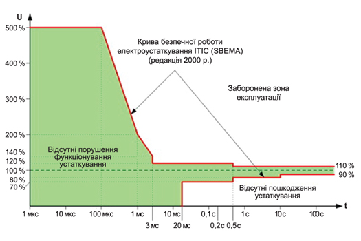 Звідси напрошується висновок – для забезпечення збереження електронного устаткування під час збурень мережевої напруги потрібний пристрій захисту. Пристрій захисту повинен мати аналогічну характеристику (з невеличим запасом для усунення помилкових спрацьовувань). Це означає, що якщо мережева напруга виходить за межі зеленої зони кривої, пристрій захисту повинен вимикати електронне устаткування від мережі.